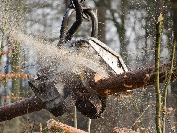 oder mit einem sogenanten Fällkran. Diese Maschine hat an seinem Ausleger eine Greifersäge und nimmt, je nach Stärke des Baumes 2-3 Meter lange Stück komplett herunter.